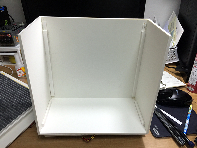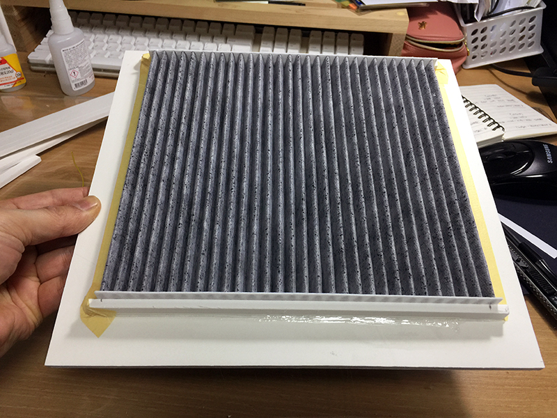사용재료 : 120mm 팬과 그릴 2ea(컴퓨터 파워에서 적출), 차량용 에어컨 필터 1ea, 5mm두께 포멕스,