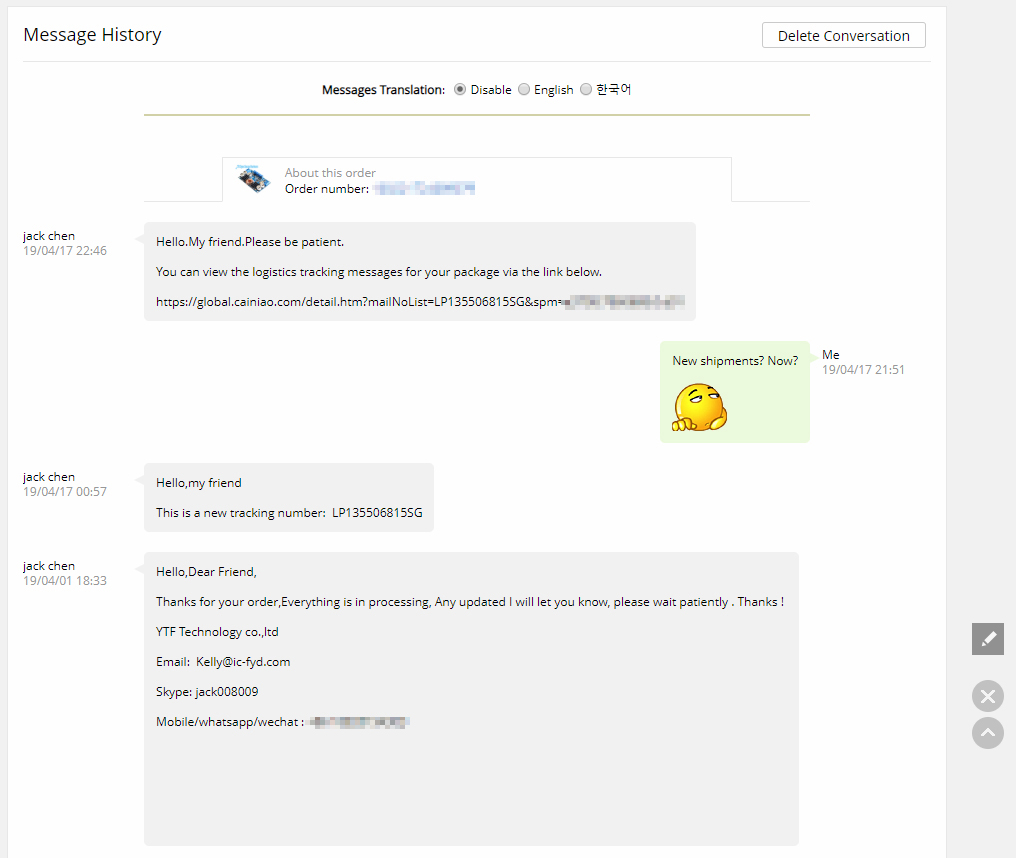 전자의 경우 미안해서 인지 위의 이미지처럼 배송이 취소되고 난 후에 다시 발송하고 트래킹 넘버와 친절하게도