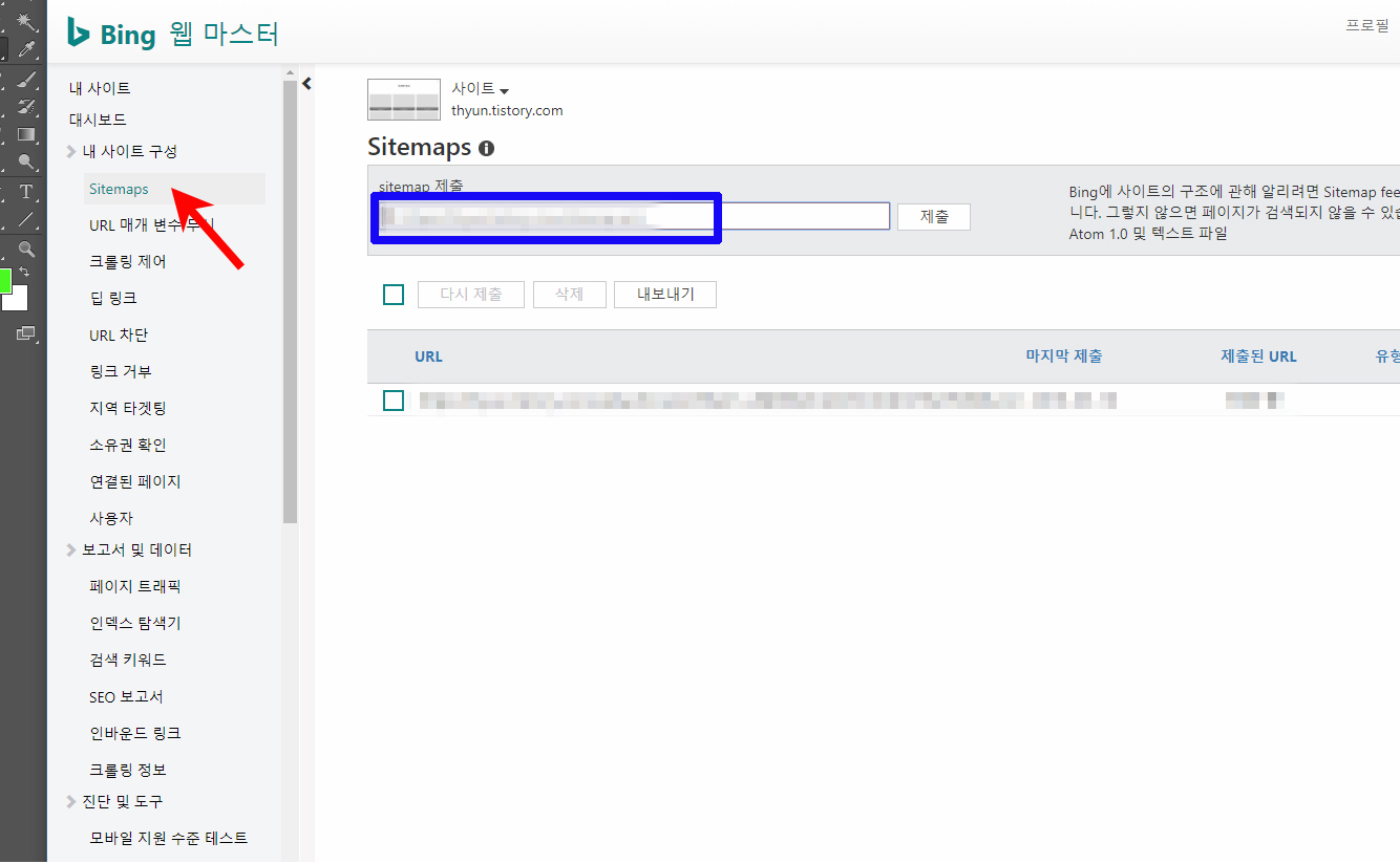 그리고 빙 웹마스터 페이지로 돌아와서 사이트맵 제출란에 아까 링크주소복사한것을 붙여넣기 하면된다.