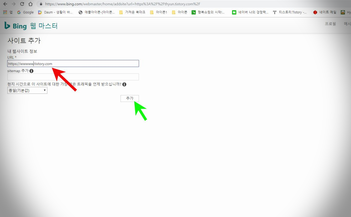 암튼 빙 웹마스터 도구 사이트 들어가면 등록하고자 하는 사이트를 상단 화살표 처럼 작성하고 추가하면 된다.