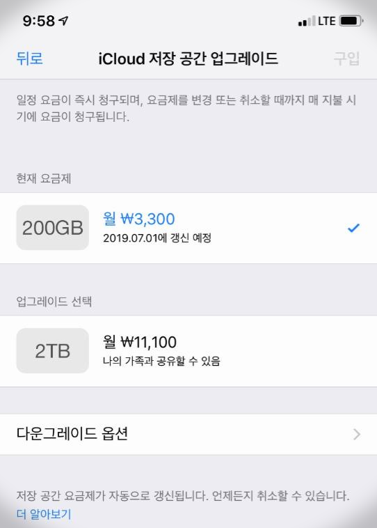 고민 끝에(NAS도 생각했었다) 가족공유가 되는 걸 알고 내계정으로 200G로 늘렸다. 추가로 1,100원만 내면 50G