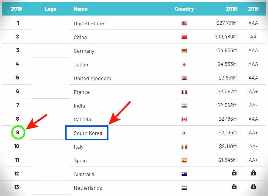 한국은 톱텐에 들어있다. 스페인은 당연히 이미 우리보다 밑에 있고, 이탈리아 또한 경제가 안 좋은 폭망인 상황이라