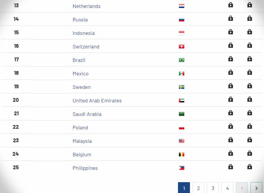 네덜란드에 이어 러시아, 그리고 인도네시아가 15위다. 네덜란드도 있지만 은근히 인구수도 무시 못하겠다.