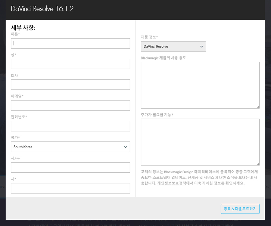 다운로드하기 누르면 다운 전에 등록 화면이 뜬다. 별 표시된 것만 작성하고 오른쪽 하단 다운로드하기 누르면 다운이 된다. 아무리 무료 버전이라고 해도 고급진 전문가적인 작업도 가능하기 때문에 이 정도의 등록은 감사하다고 생각하면서 작성하자.ㅋ 개인정보 같은 건 없으니 아무 걱정 없이 등록하면 된다. 그리고 다운로드하고, 설치를 하자. 다운받으면 압축을 풀고, 설치를 하면 되는데 설치중간에 옵션선택은 만지지 말고 그냥 다음 눌러서 설치하면 된다.