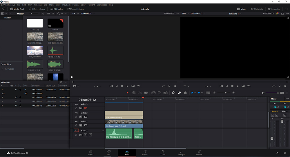 이 화면이 공포의 퓨전 탭 편집 창이다. ㅋㅋ 사소한 작업이지만 이 작업에서 자주 튕겼다. 그만큼 컴 리소스를 많이 잡아먹는듯하다. 원활하게 사용하려면 최소한 그래픽 카드 정도는 업그레이드하고 사용하길 빈다. 물론 여유가 된다면 CPU, 메모리, 파워, 그래픽카드 다 업그레이드하면 좋겠다. 암튼, 다빈치 리졸브는 그래픽카드라는 것이 중요하다는 말이 있다. 충분히 안정적인 그래픽카드 및 설치 드라이브를 사용하시길~빈다. 참고로 다빈치리졸브의 설치 실행의 권장사양은 없다. 그냥 최고사양, 높은사양, 최신사양컴퓨터일수록 빠릿하고, 코딩도 빨리 된다고 하니 참고하자.