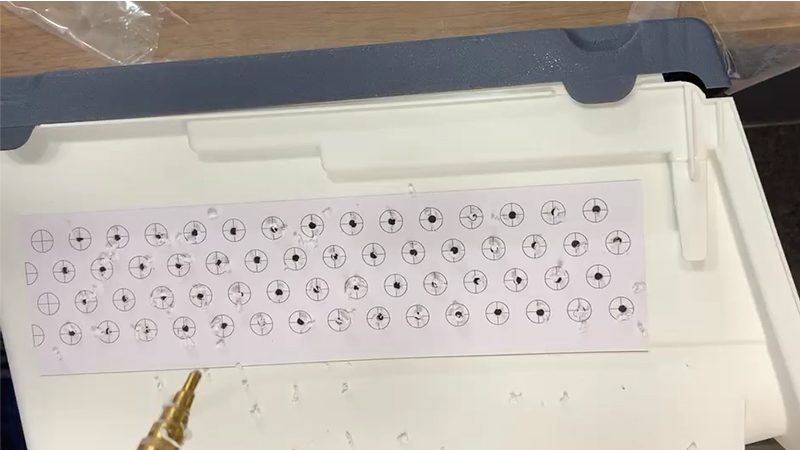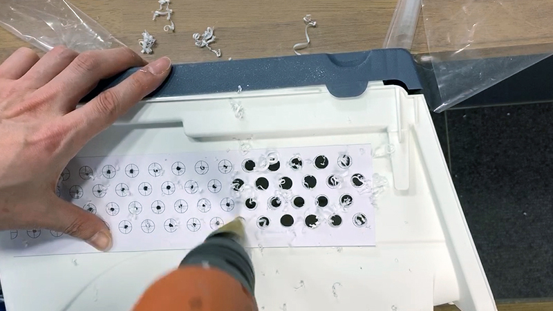 먼저 구멍위치를 정확히 잡아놓고, 프린트해서 붙여서 초벌로 얇게 드릴로 뚫어준다.