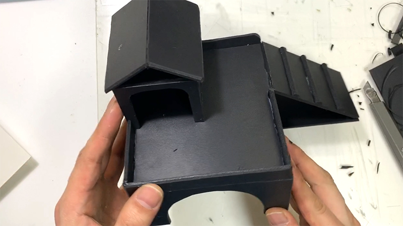 검정 포멕스 3mm로 만들었다. 백색으로 만들려고 했으니 햄스터가 어두운 곳을 좋아한다길래 검은색으로 낙찰~! 포멕스가 연질이라 칼로 잘 잘리고, 조각이 용이하다. 그래도 손은 조심~!