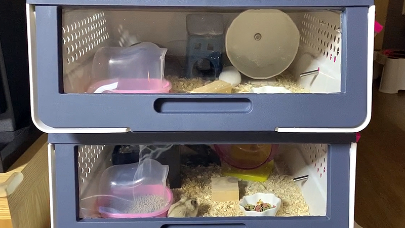 이제 뚜껑을 덮고, 이층으로 올려준다.ㅋ 드디어 완성이다. 아이들 자는 시간에 만들었는데, 의외로 시간 안 걸리고, 어렵지 않게 만들었다. 만들고 이층으로 쌓아보니 영화에서 나오는 우주선에서 키우는 모듈형 성장 시스템 같아 보인다. ㅡ,.ㅡ 암튼 햄스터들이 위에놈과 아랫놈 모두 쳇바퀴 잘 돌리고 만들어 놓은 은신처에도 잘 돌아간다. 그런데 화장실도 사서 넣어줬는데, 들어가기는 잘하는 것 같은데, 들어가서 그냥 노는 건지 응가나 쉬야를 하는건지 도통 모르겠다. 아직 어려서 그런가? 아직 화장실을 못 가려서 그런가?! 뭐 암튼 더 지켜보면 알겠지~ 그리고 또 한가지 이넘들이 야행성이라 낮에는 자고 밤부터 활동하기 시작하는데 밤이 되고 집안에 불이 꺼지고 자는 시간이 되서야 쳇바퀴 돌아가는 소리가 요란하게요란하게 들린다. ㅋ 그렇다고 잠을 못 잘 정도는 아니고, 욘석들~ 쳇바퀴 돌아가는 소리만 들어도 귀엽다.ㅎ
