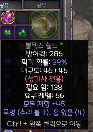 그러다 어느 순간 주운 망명 재료~ 지존급 재료라고 한다. 볼텍스 실드 자체도 잘 안 나오지만 모든 저항 45에 홈 4개에다가 에테(무형)다. 오~! 그래서 자주 정보를 얻는 사이트에 가서 감정을 부탁했고~ 팔았다. ㅋㅋ 부르는 게 값이다 정도는 아니지만... 가격을 괜히 낮게 넣은 듯 ㅠㅜ 더 비싸게 팔 수도 있었는데...