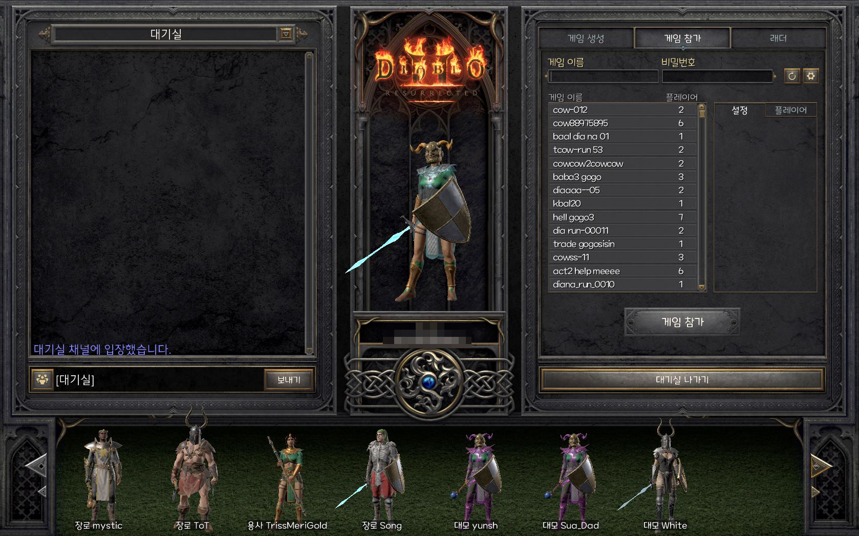 암튼 서버에 대해서는 각설하고 서버가 열려서 접속해 들어간 화면이다. 그런데 여기서도 서버 다운은 마찬가지, 케릭 선택 후 아래 대기실로 들어간다.