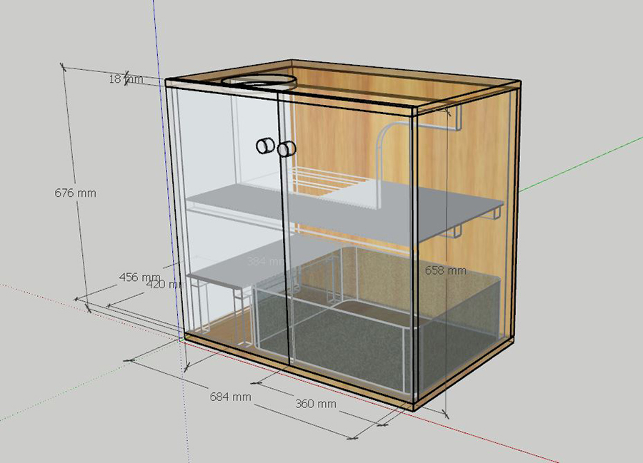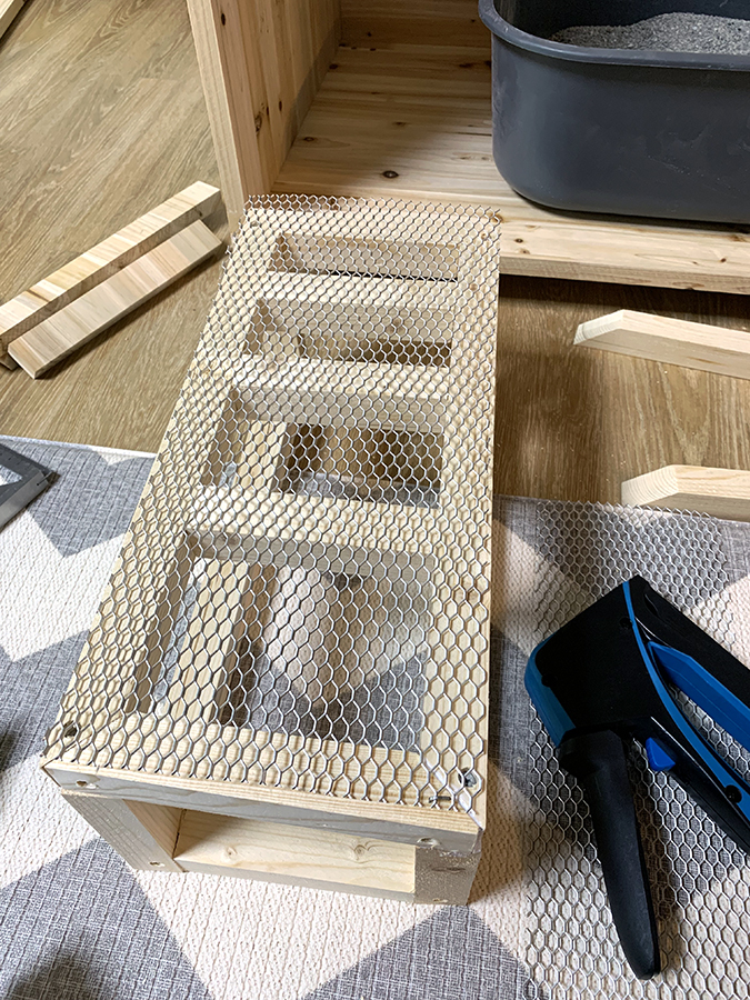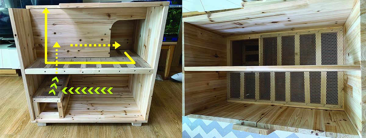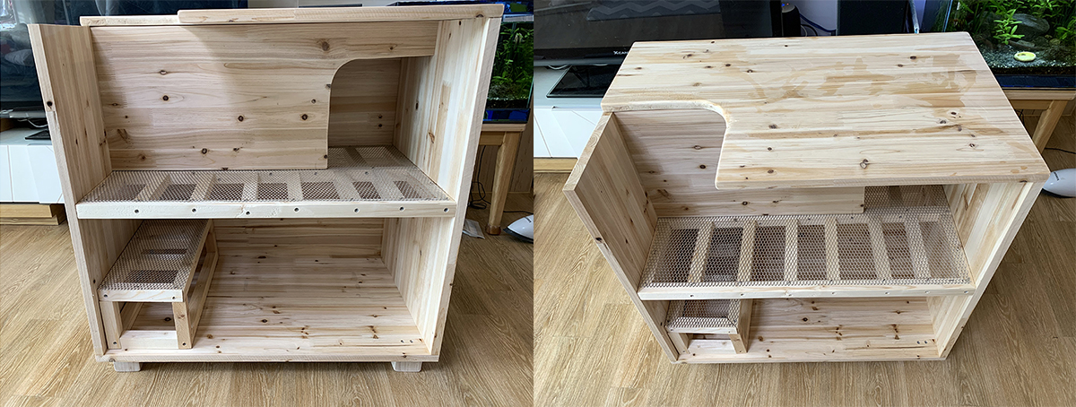 고양이가 모래에서 나온 후 제일 처음 발을 딛게 되는 발판인데, 이것이 설계대로 되지가 않았다. 한치각으로 뼈대를 만들다 보니 모양새가 좋게 안 나오더라. 그리고 손수 톱질로 자르고 하느라 직각과 45도 각이 제대로 나올 리가 만무했다. 그래서 삐뚤빼뚤이다. 하기사 내부에 있어 안 보이는 부분이라 대충 만든 것도 어느 정도 있다. 각도절단기로 했으면 작업시간이 훨씬 단축됐으리라 본다. 하지만 아파트에서 각도 절단기는 절대 무리다. 아파트베란다 목공의 한계다. 공구가 제대로 없는 상태에서는 거의 중노동에 가까운 듯 ㅜㅠ.(아직도 어깨가 쑤신다. ㅜㅠ)