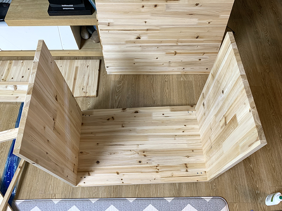 상판까지 얼추 완성했다. 역시나 상판도 삐뚤빼뚤이다. 사포질로 어느 정도 커버했다.