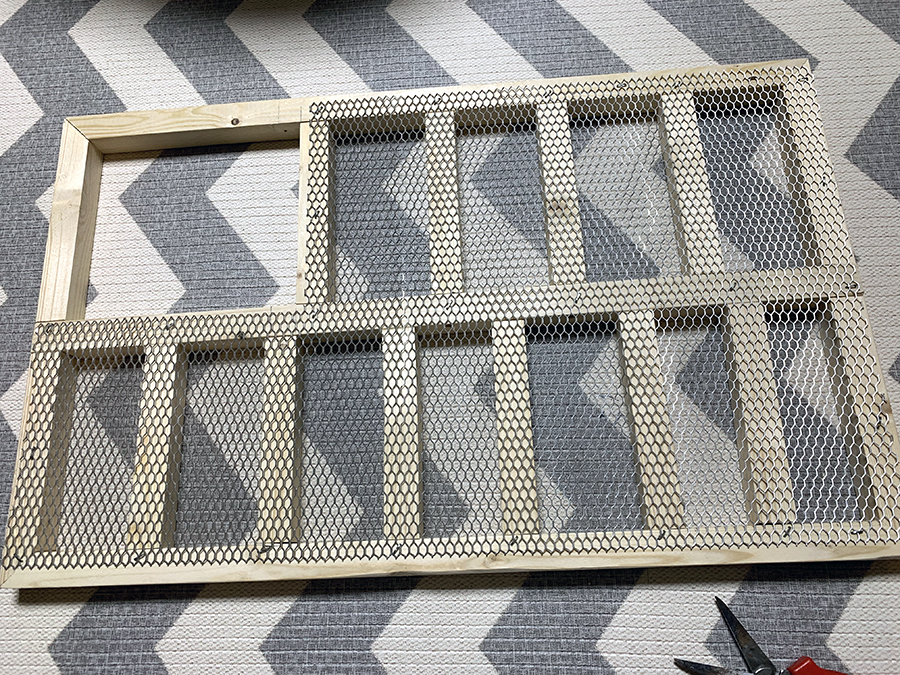 솔직히 알루미늄망이 아니고 스텐망이나, 조금 딴딴한 철망으로 했으면 가운데 구조목을 적게 넣어도 되었을 것이다. 알루미늄망이 많이 잘 휘어져서 저렇게 가이드를 많이 넣어줬다. 아까도 언급했지만 한치각을 얇게 잘라서 에어타카로 하면 훨씬 더 깔끔하고 시간도 단축되었을 것인데, 아파트에서는 어쩔 수 없는 부분이다. 밴드쏘 정도면 괜찮을 듯한데, 마눌님의 눈초리가 너무나 따끔해서~ 죽을 지경이다. ㅜㅠ.